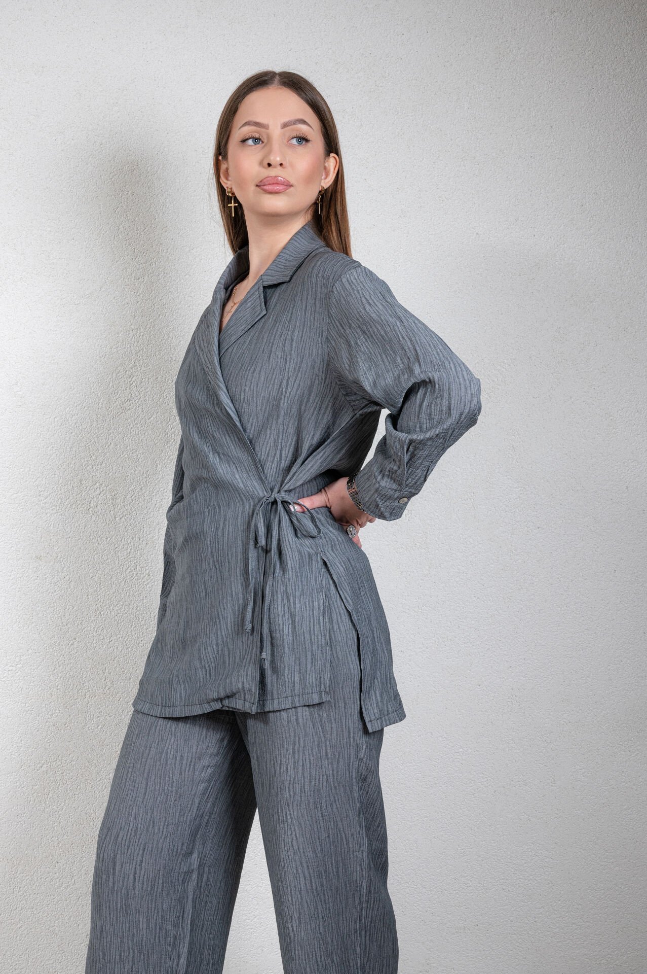 Antrasit ceket yaka uzun kol, önden bağlamalıdır.Üst ürün boyu: 75 cm, kol boyu 52 cm, alt ürün boyu 110 cm.