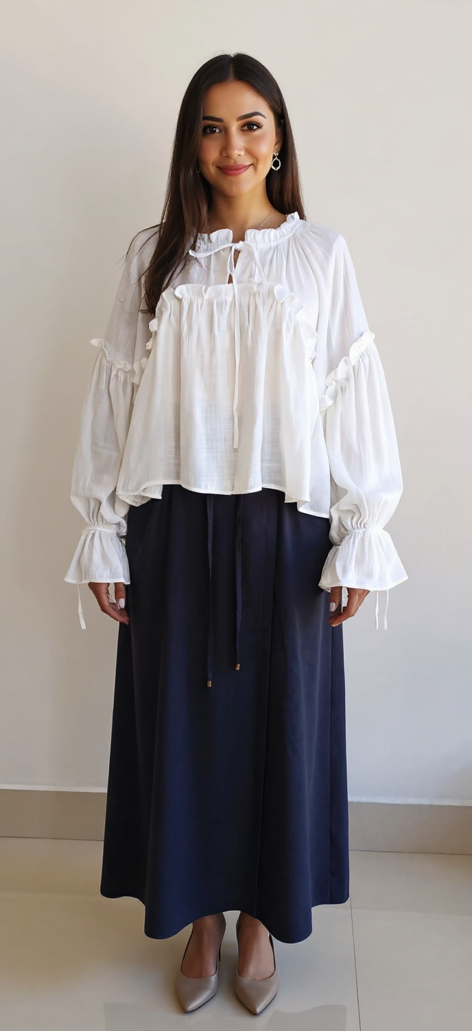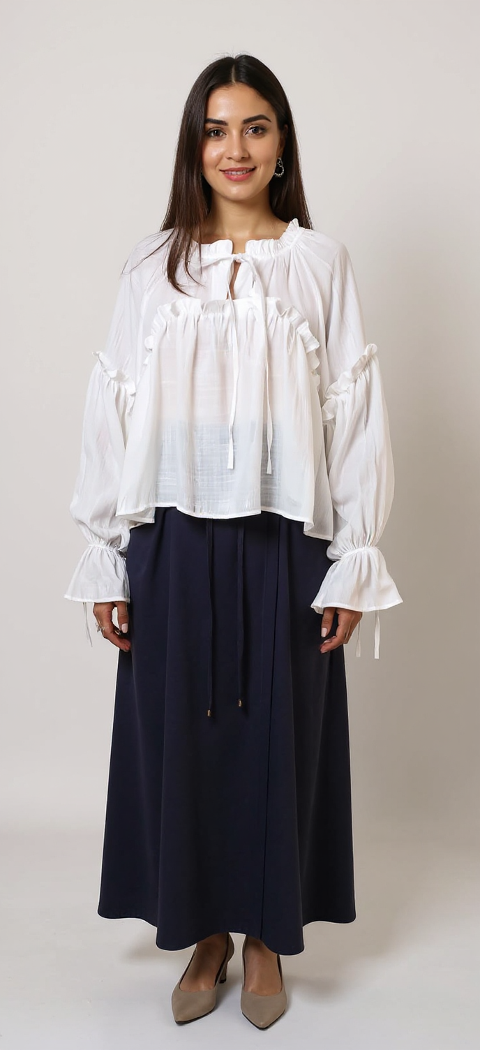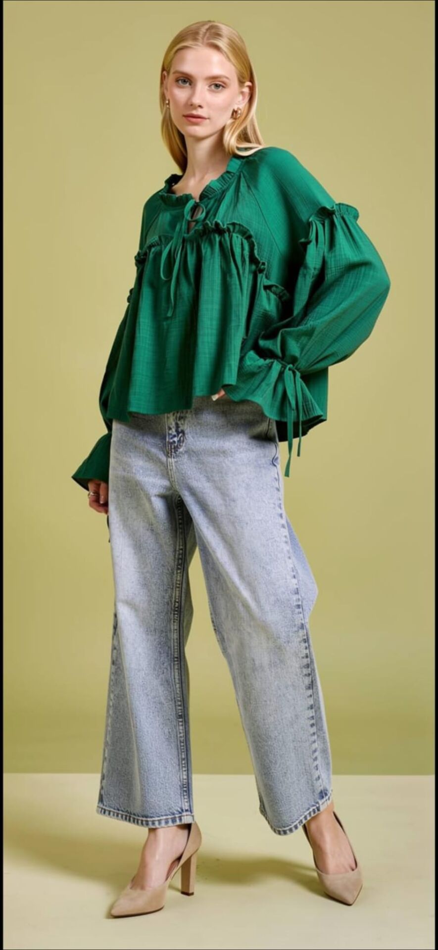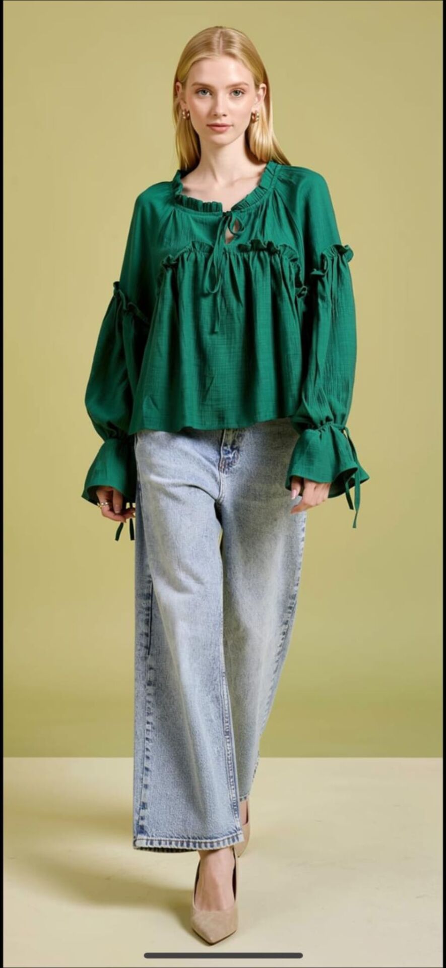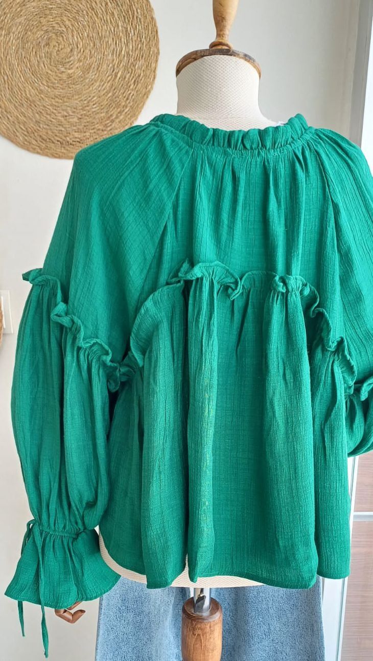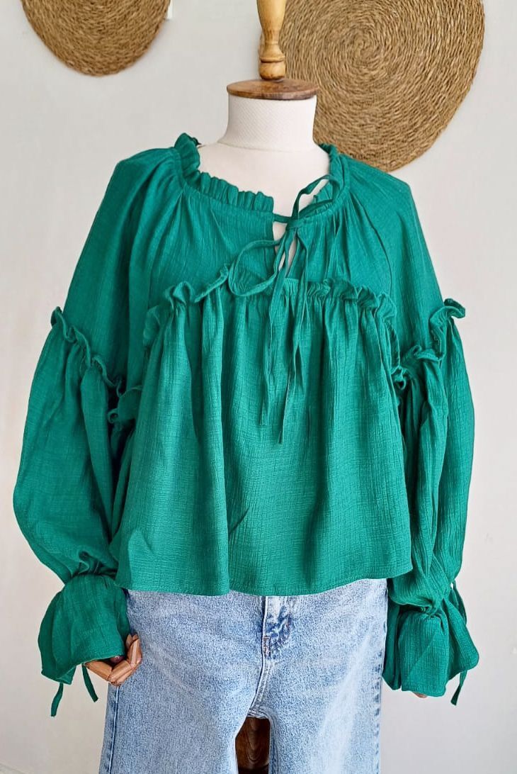 Boyu 53 cm, kolu 46 cm, yakadan bağlamalı, % 100 floş viscos kumaş, kolu lastikli, zümrüt yeşili fırfır detaylı bluz.