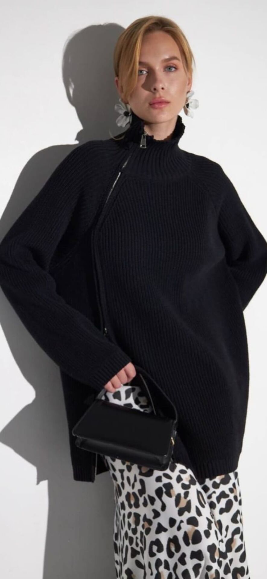 Yanı çift taraflı fermuarlı siyah kazak boy 78cm std beden %50 cotton %50 polyester