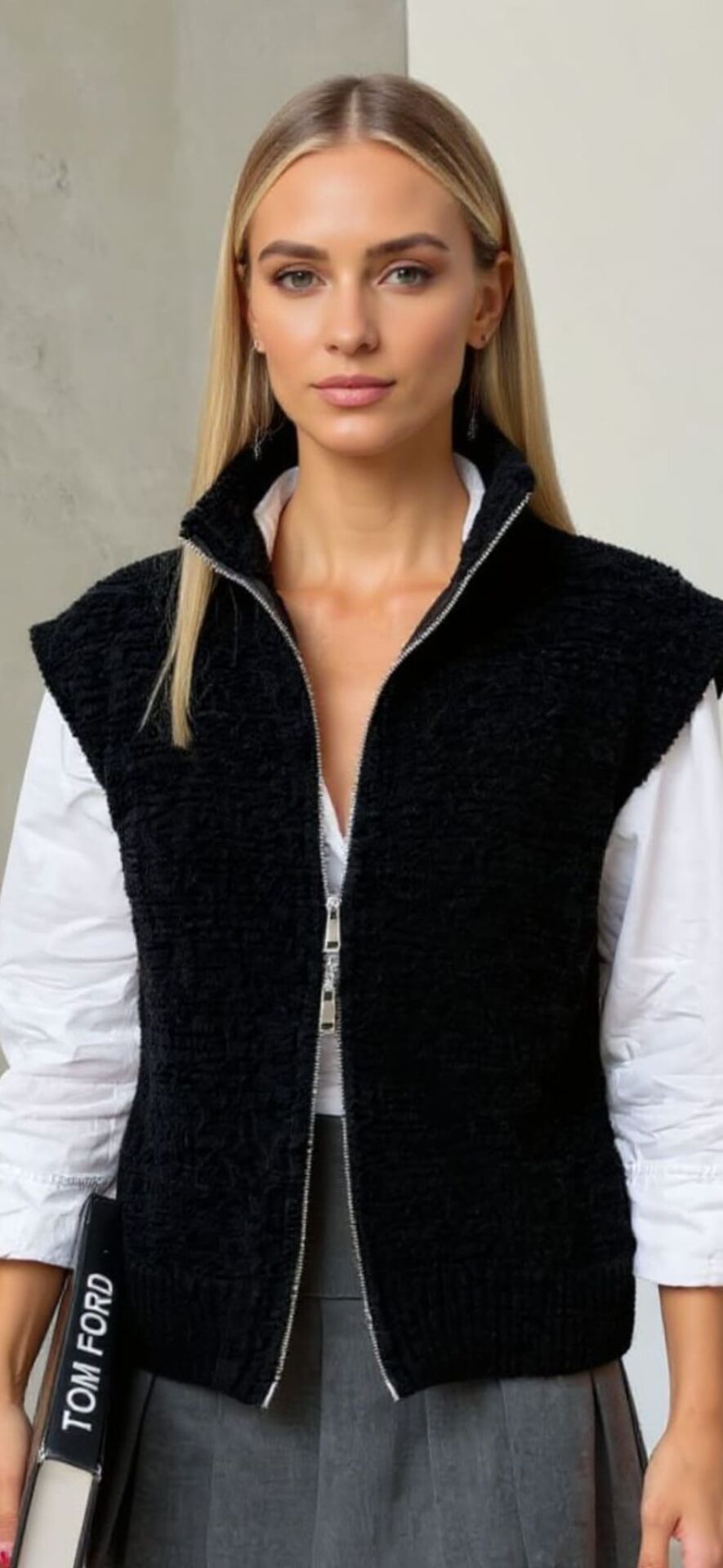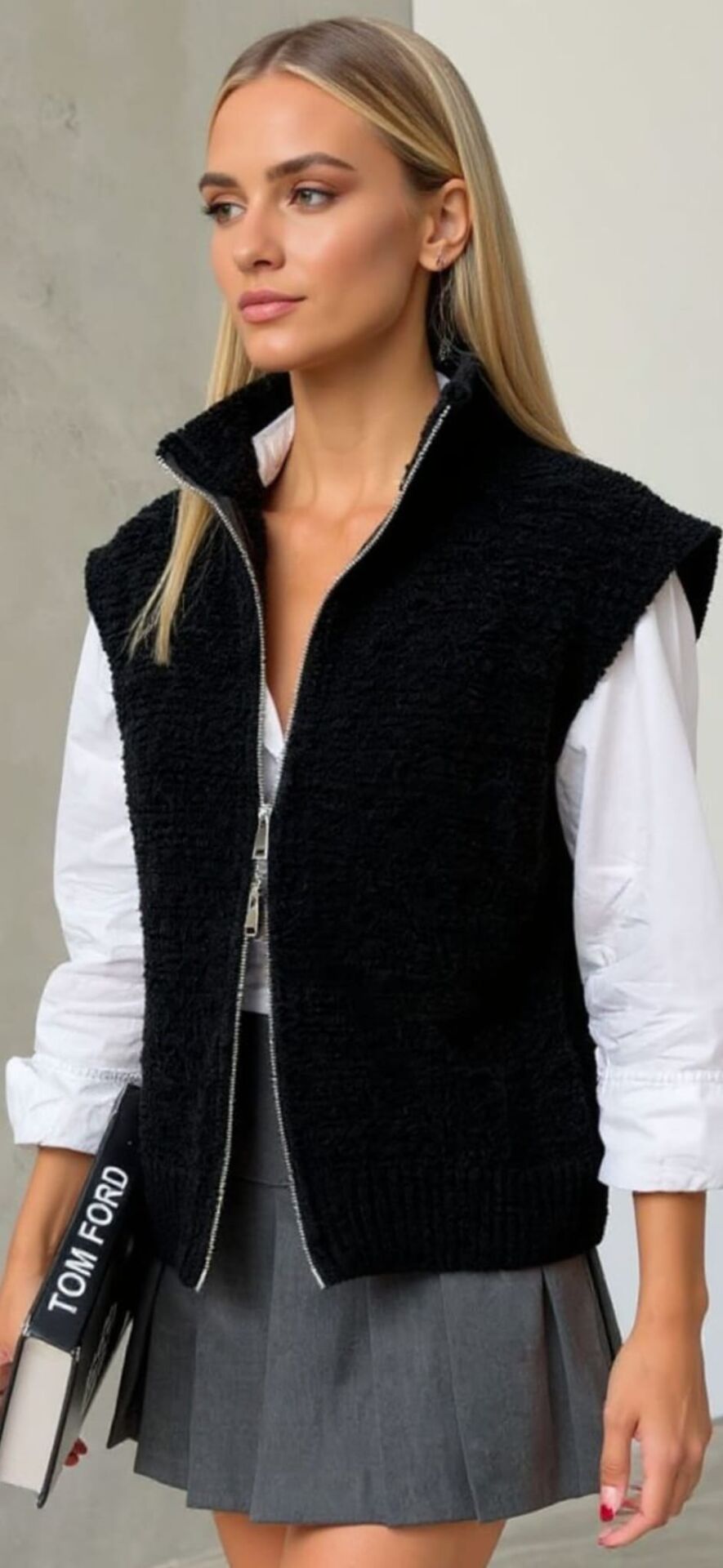 Small boy 62, çift taraflı fermuarlı, yüzde yüz akrilik, siyah buklet yelek.