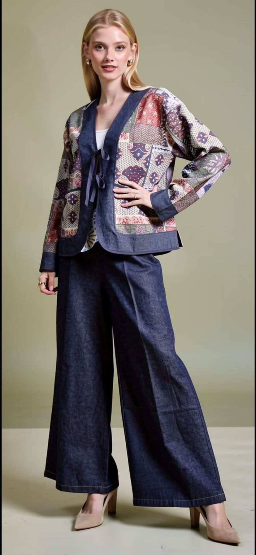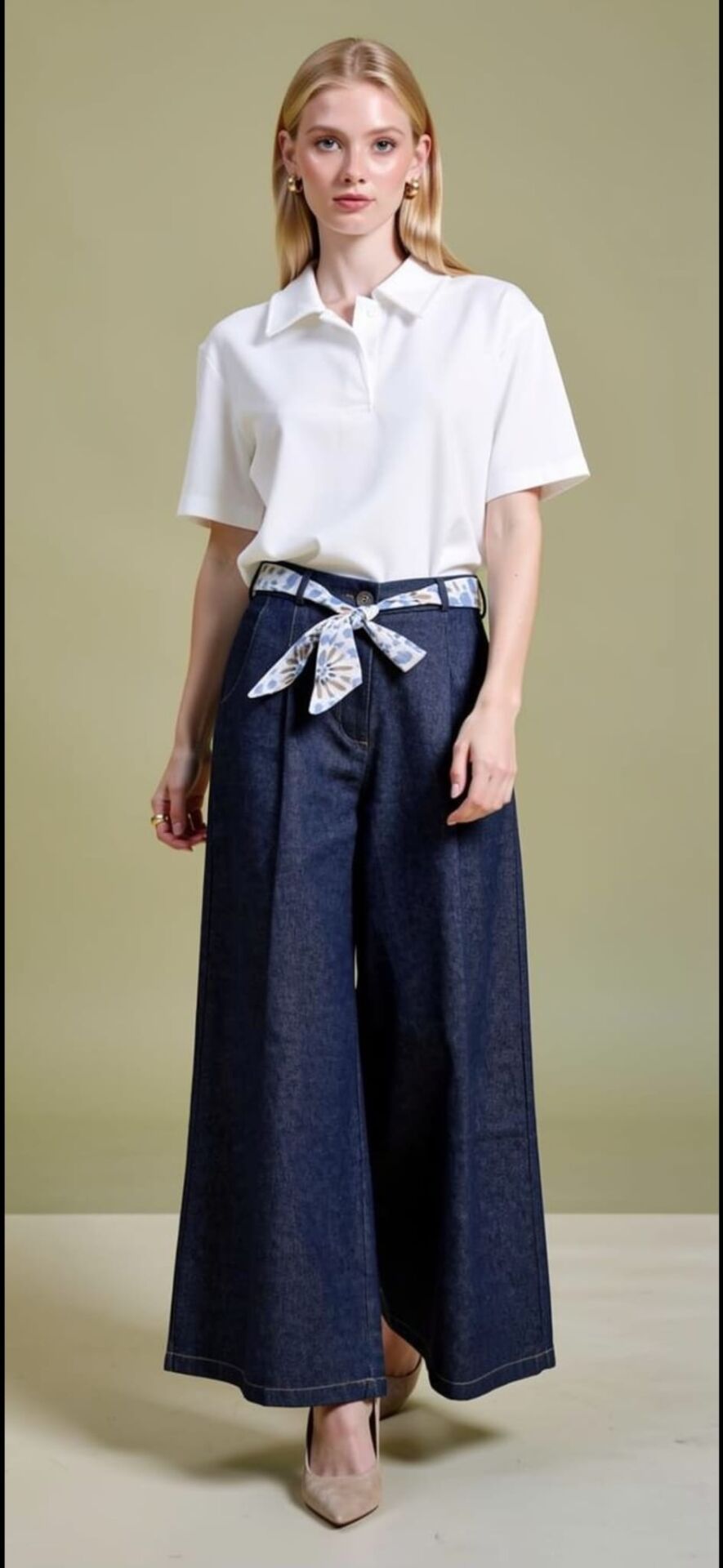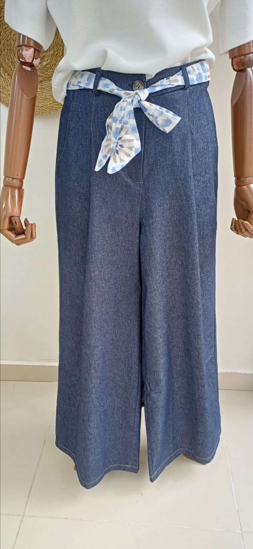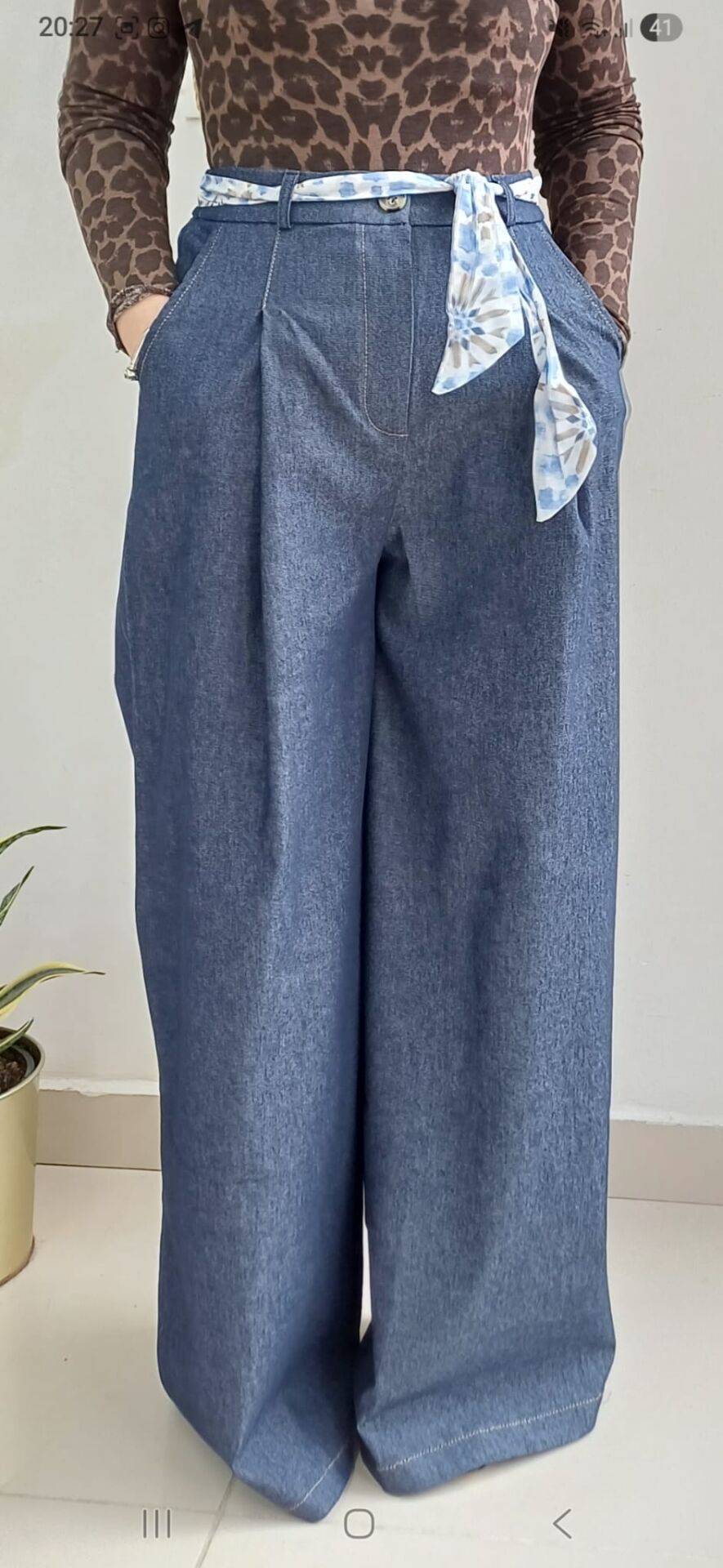 İndigo pileli cepli bol pantolon desenli kumaş kemerli %100 polyester