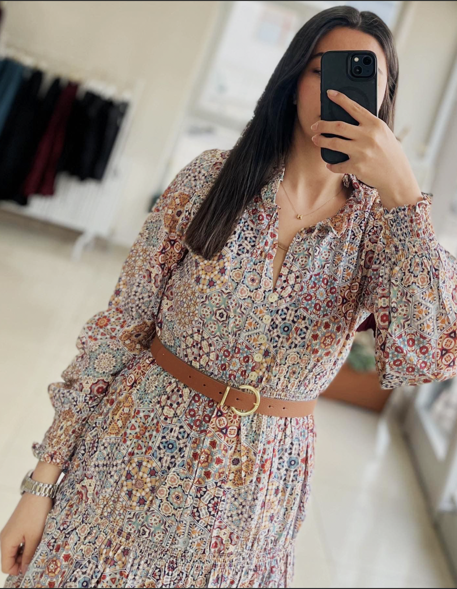 Uzun kollu, fırfır yakalı, beli lastiklidir.Ürün boyu 126 cm, Kol boyu 60 cm