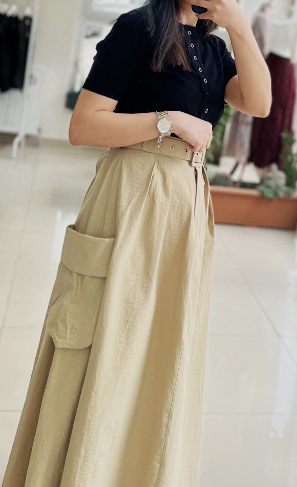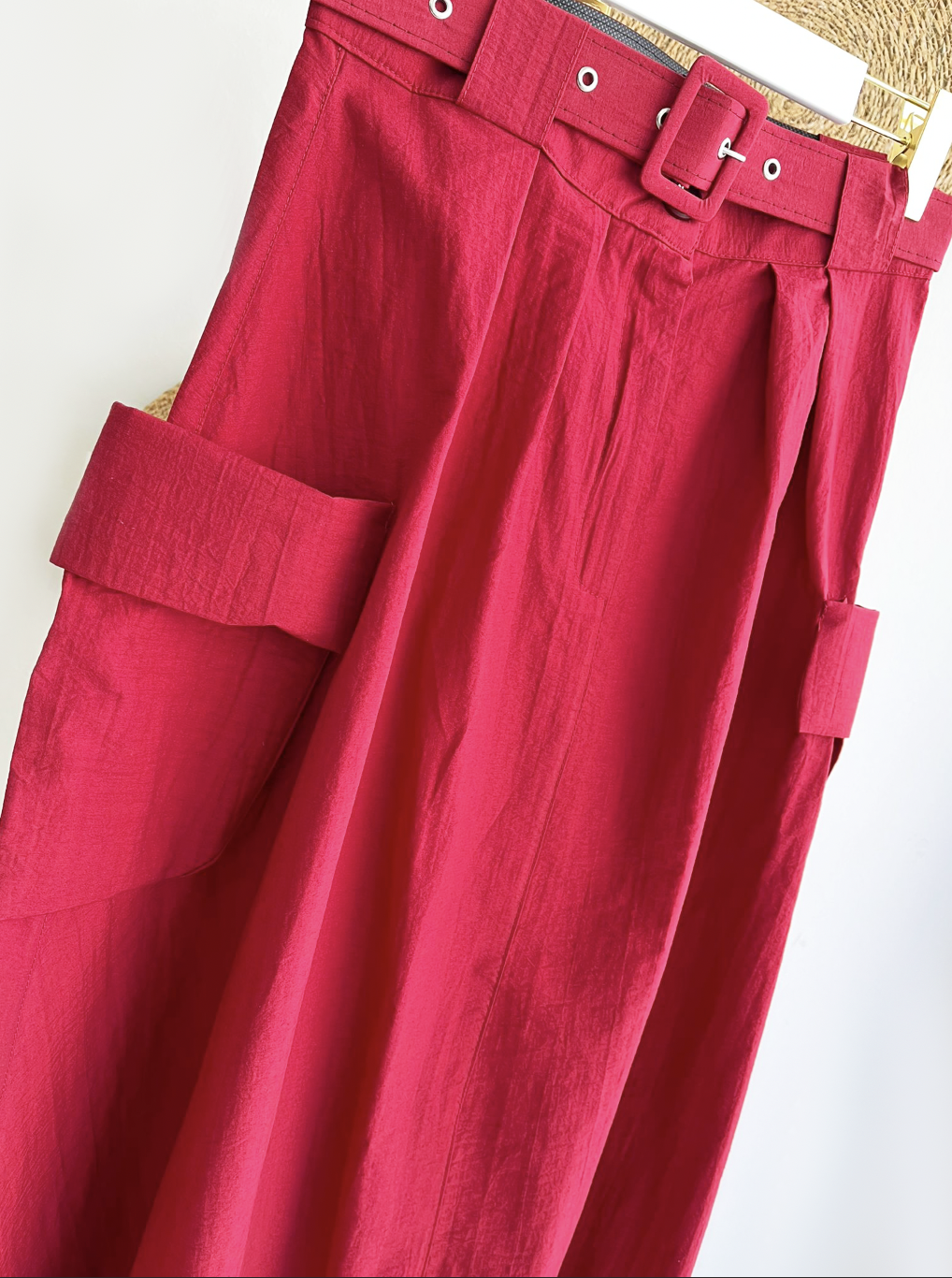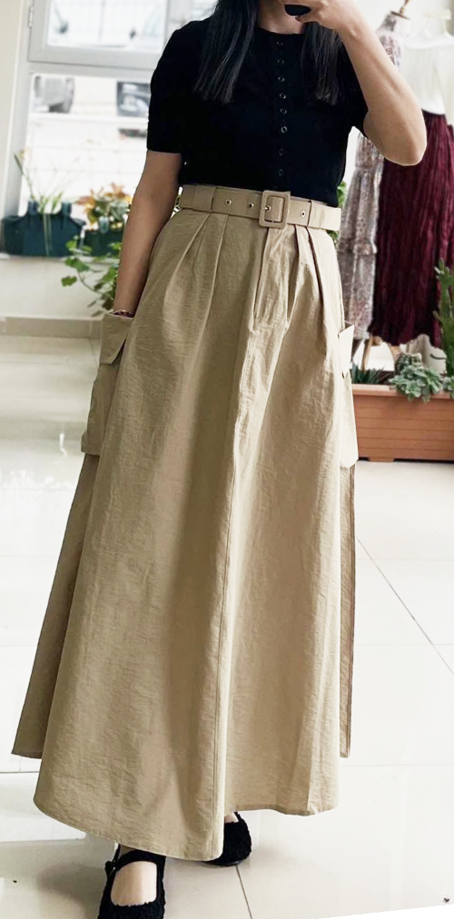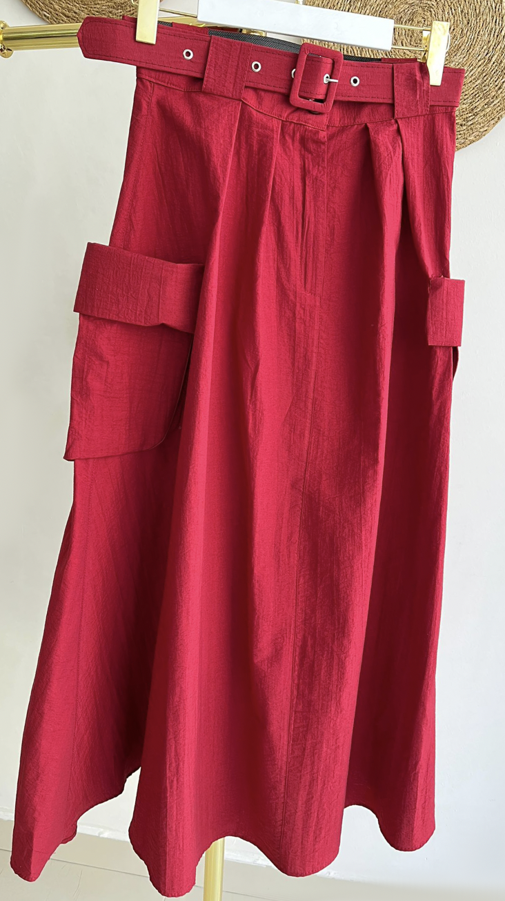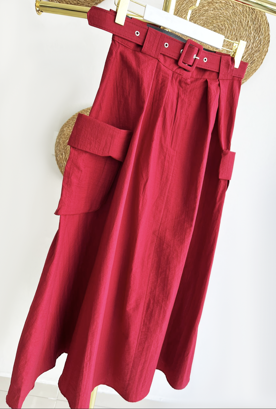 Boy: 85, Bel: 27 lastikli kendinden kemerli, cep detaylı etek. %95 Koton + %5 Lycra kumaş. Bordo ve vizon renk alternatifi bulunmaktadır.