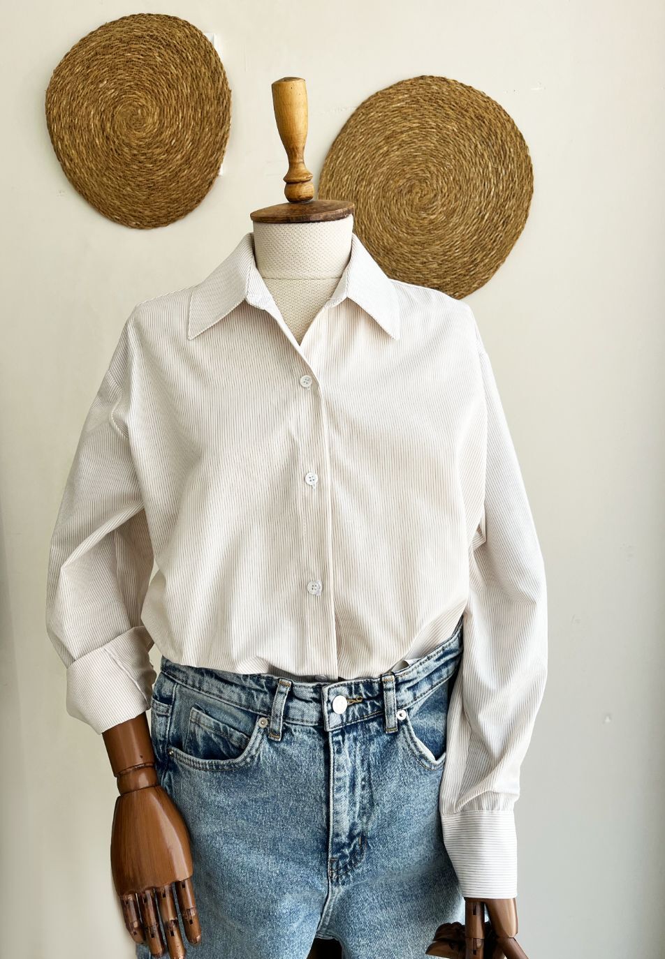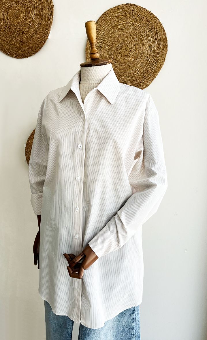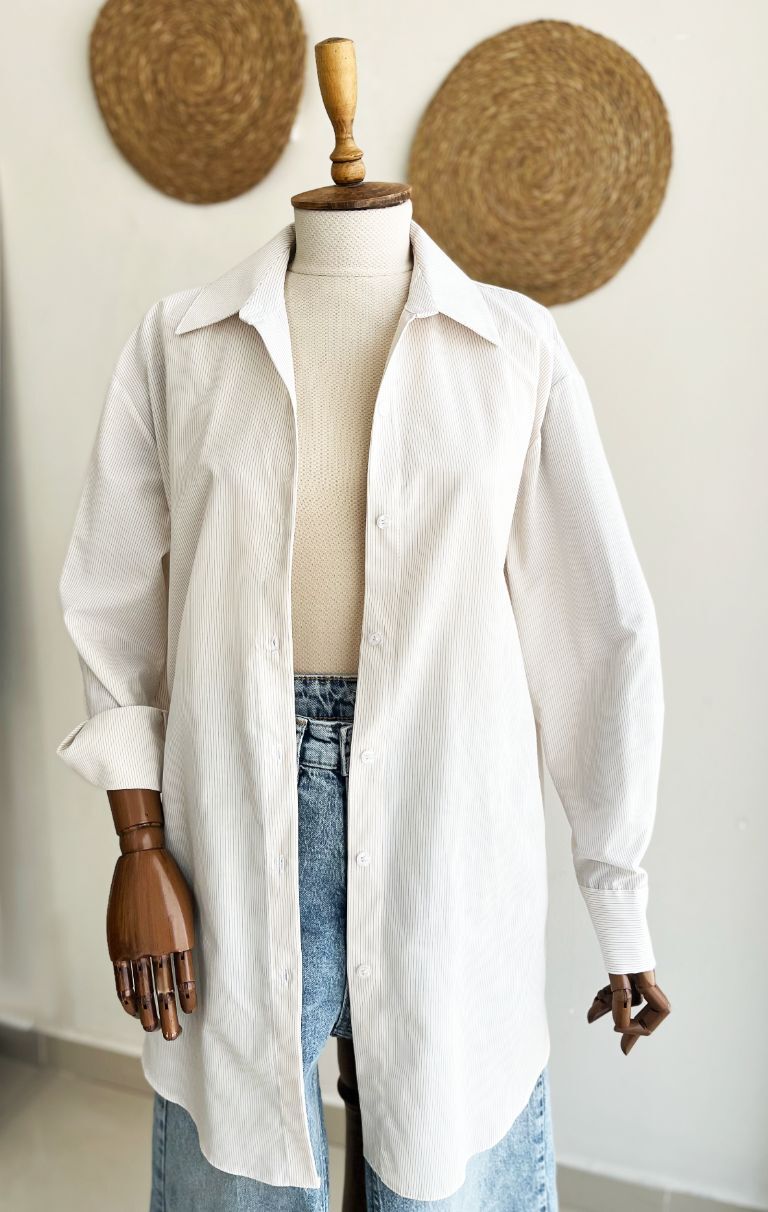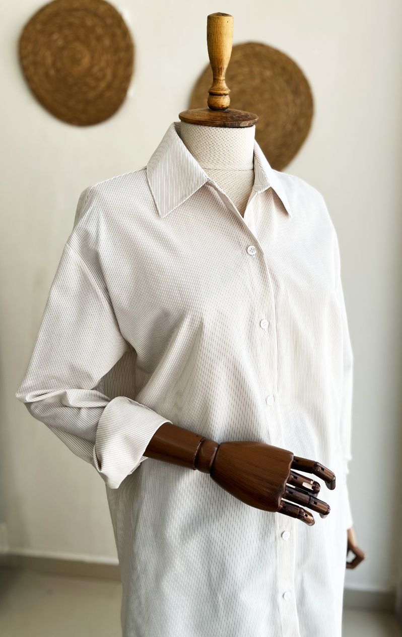 Boyu 81cm, kol boyu 56cm, önden düğmeli, kolu manşetli terikoton krem gömlek.