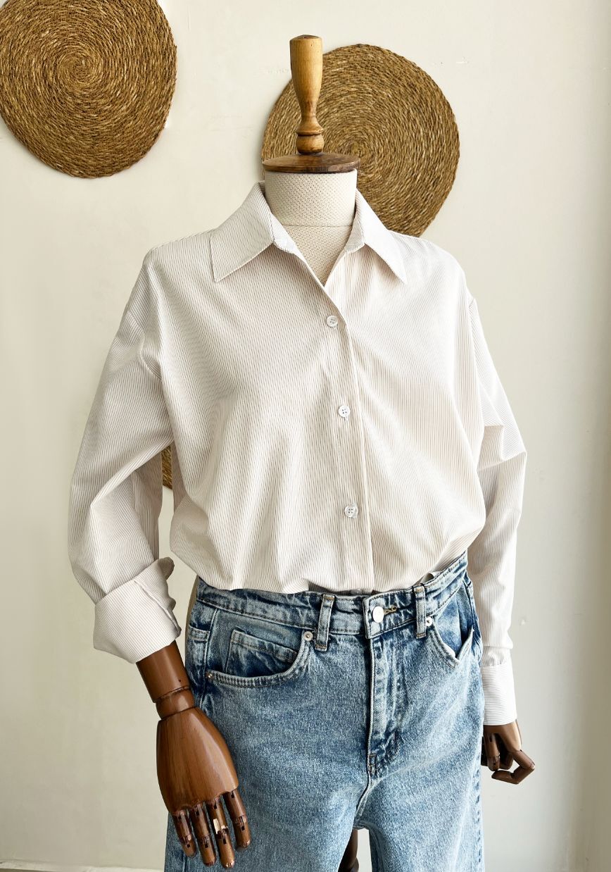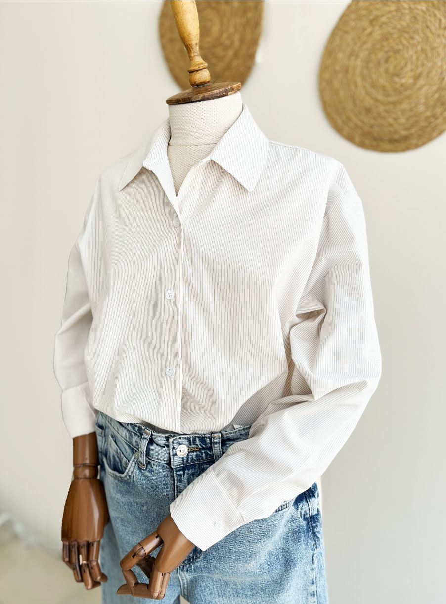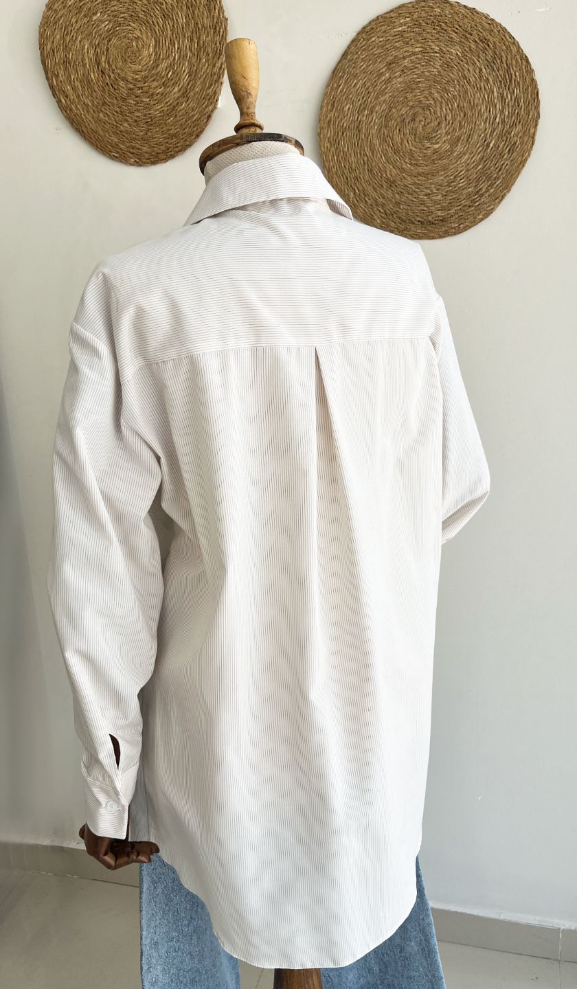 Boyu 81cm, kol boyu 56cm, önden düğmeli, kolu manşetli terikoton krem gömlek.