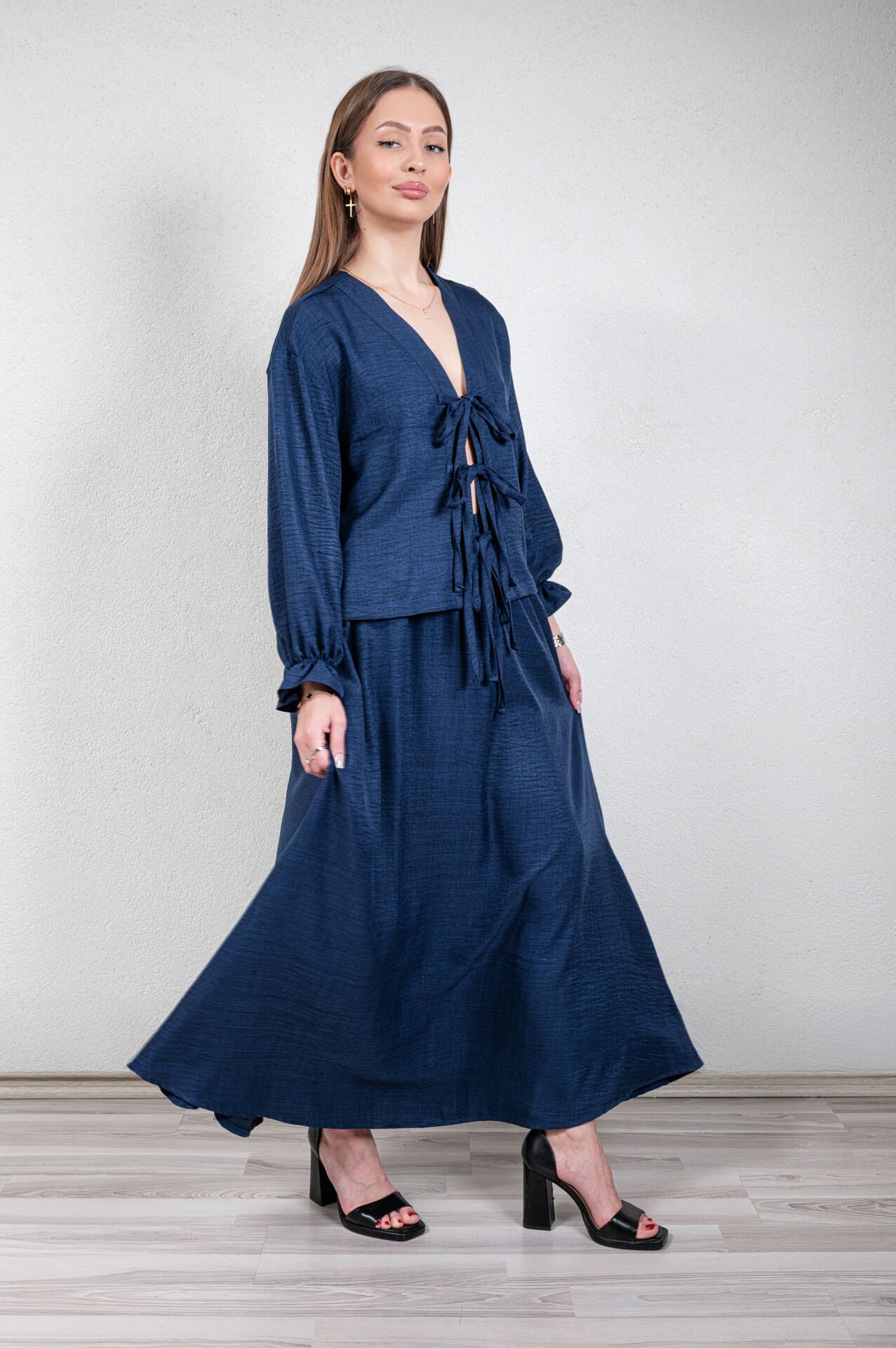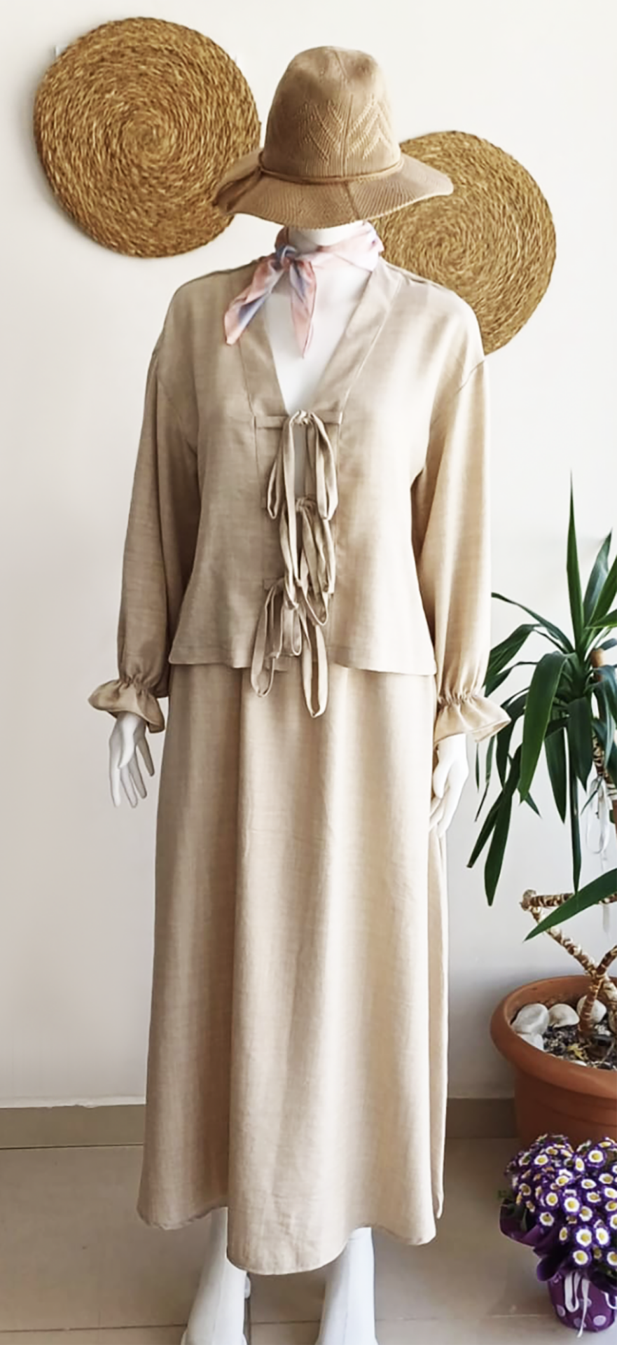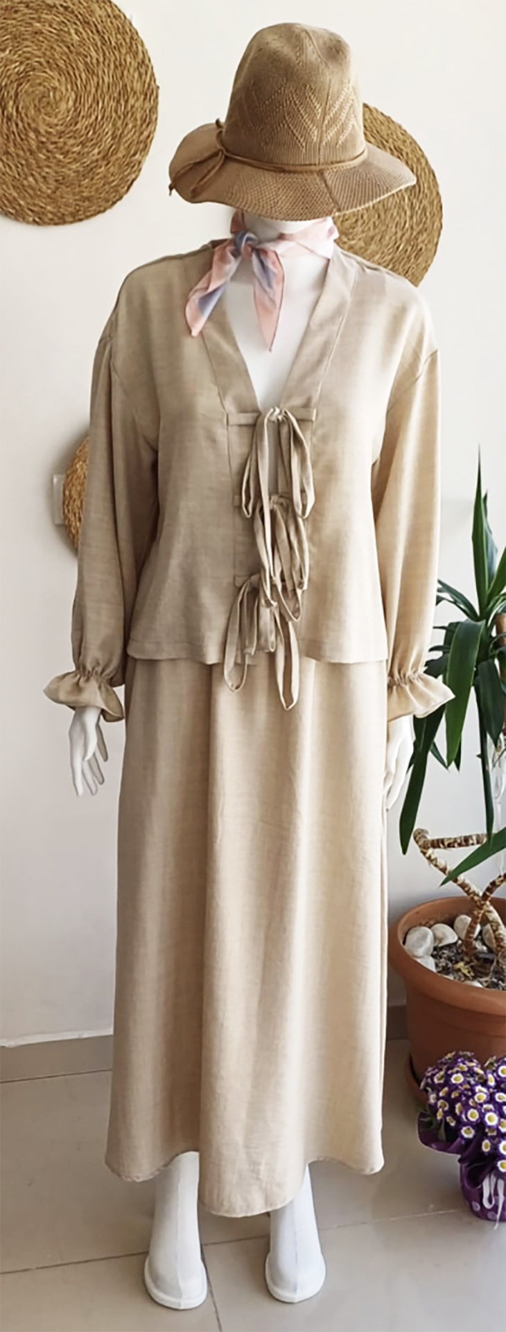 V yakalı uzun kollu, kolu lastikli önden bağlamalı ceket, beli lastikli kloş etek.Üst ürün boyu: 54 cm, kol boyu 52 cm, alt ürün boyu : 97 cm.