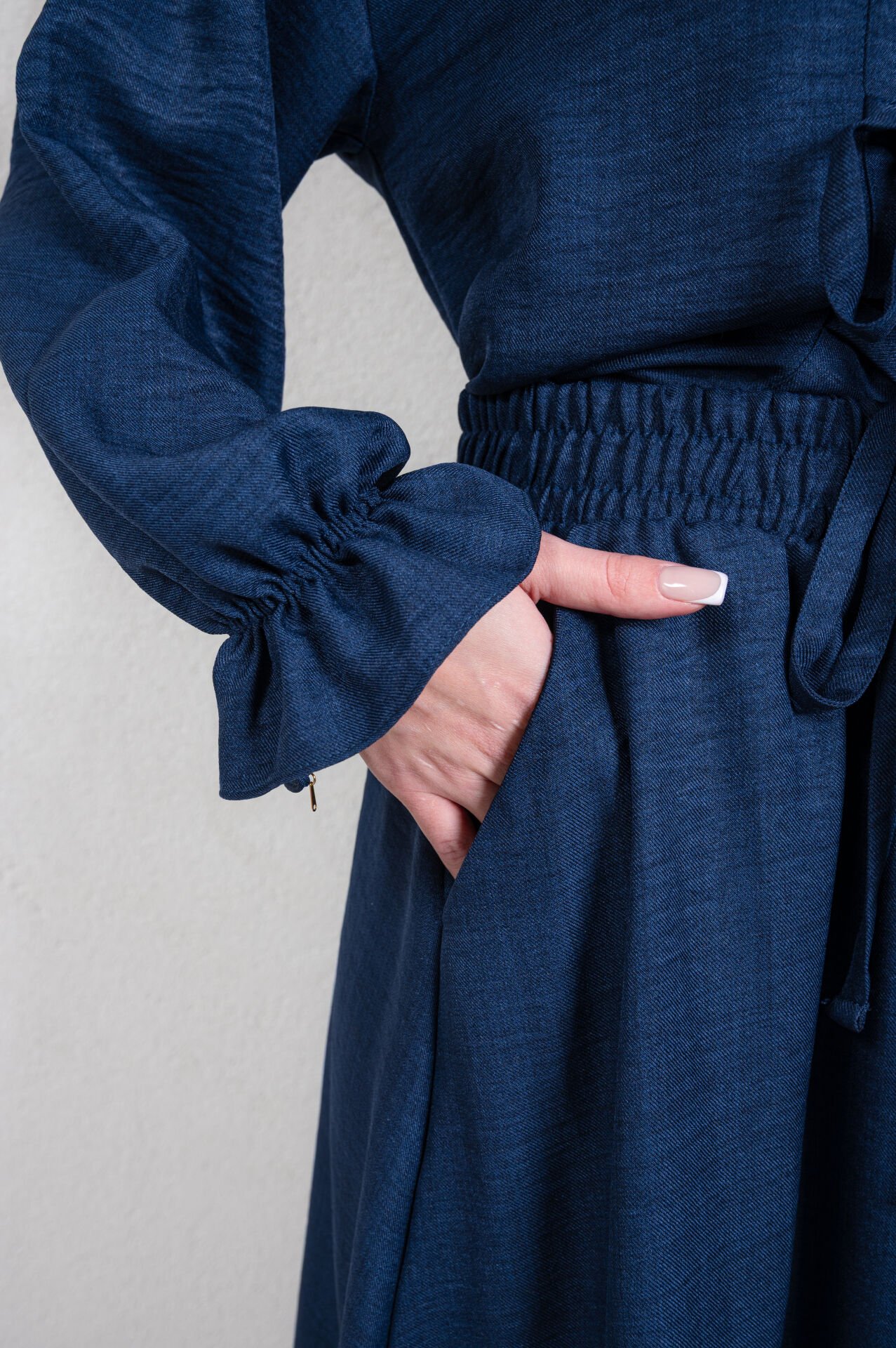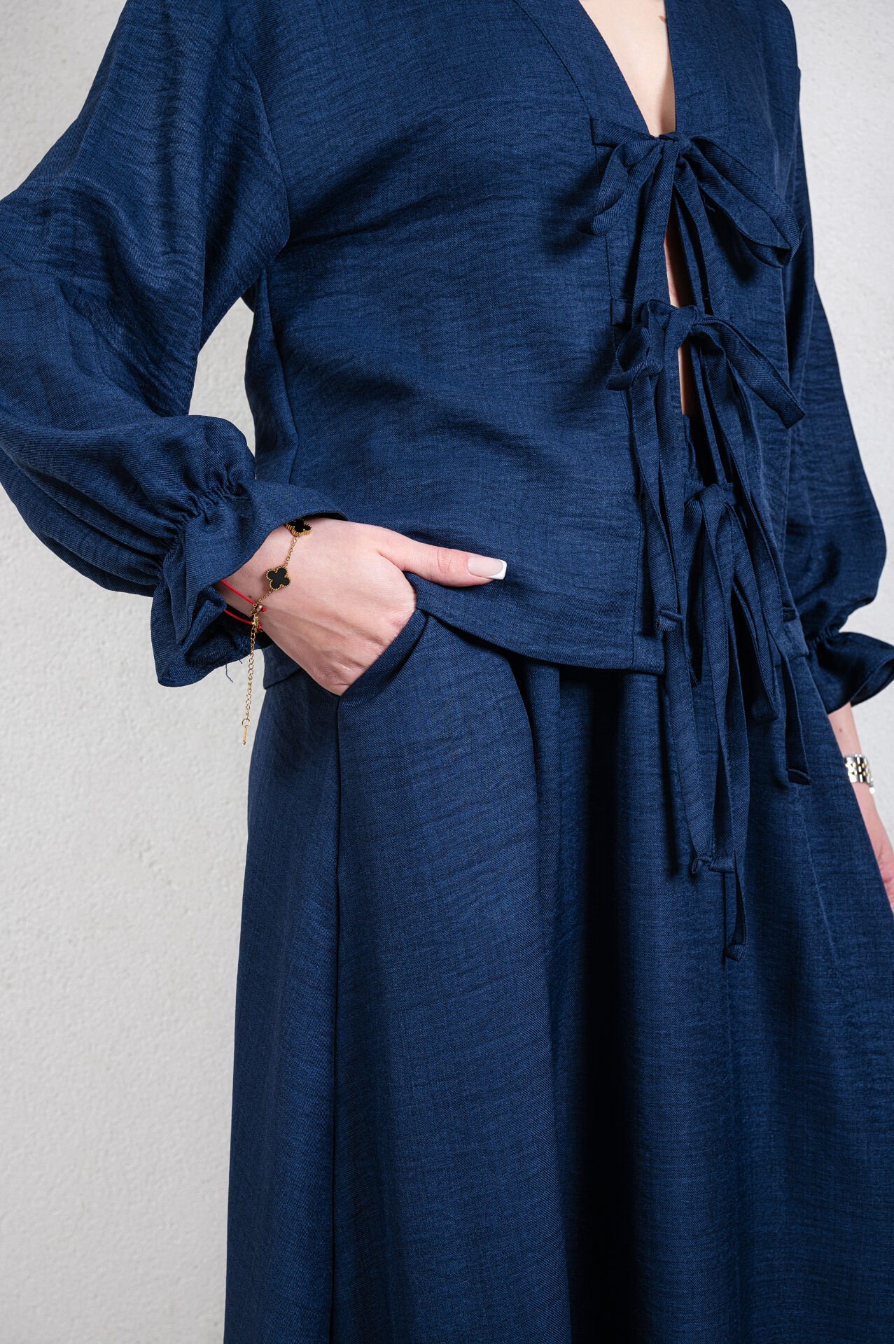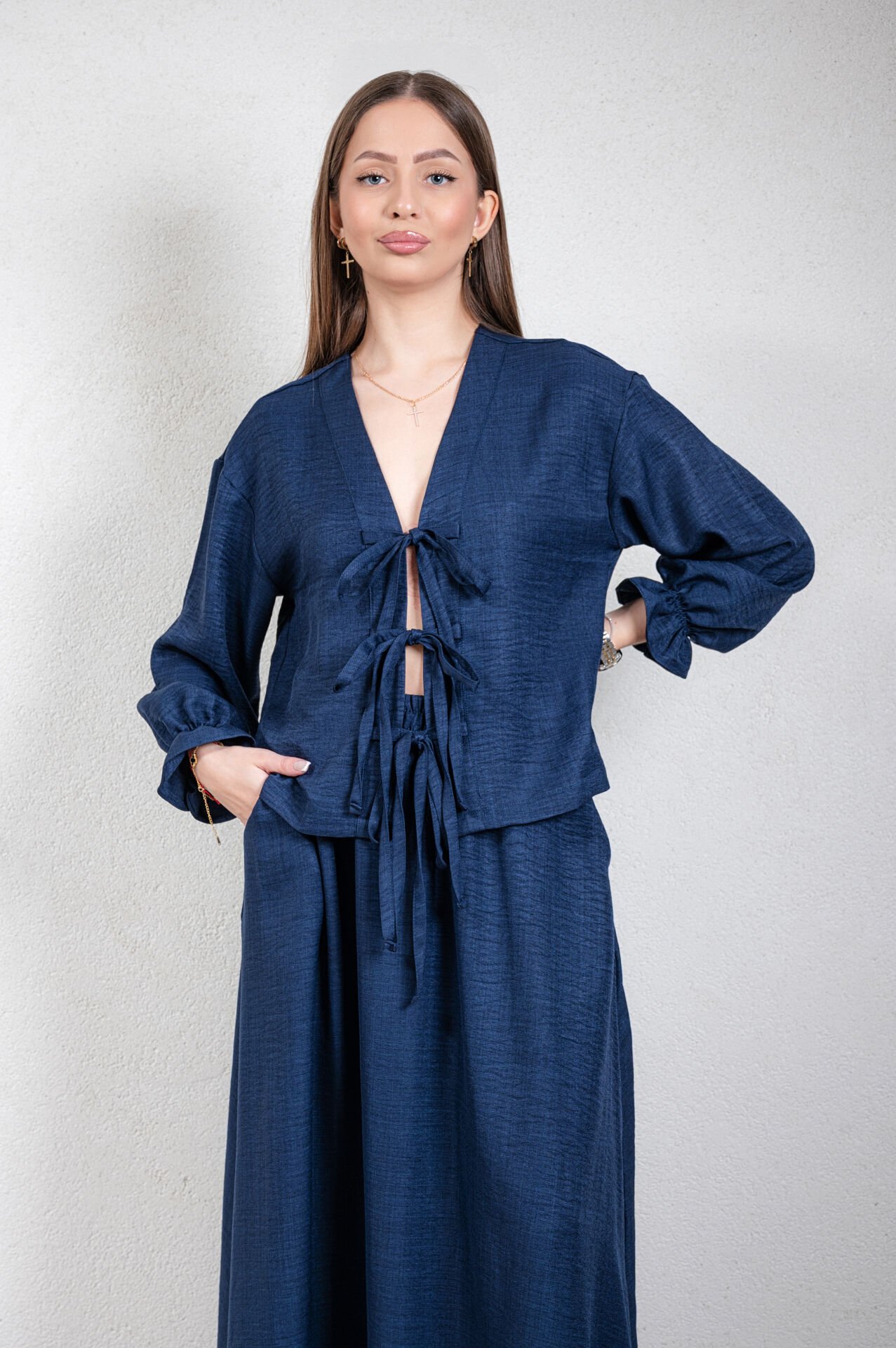 V yakalı uzun kollu, kolu lastikli önden bağlamalı ceket, beli lastikli kloş etek.Üst ürün boyu: 54 cm, kol boyu 52 cm, alt ürün boyu : 97 cm.