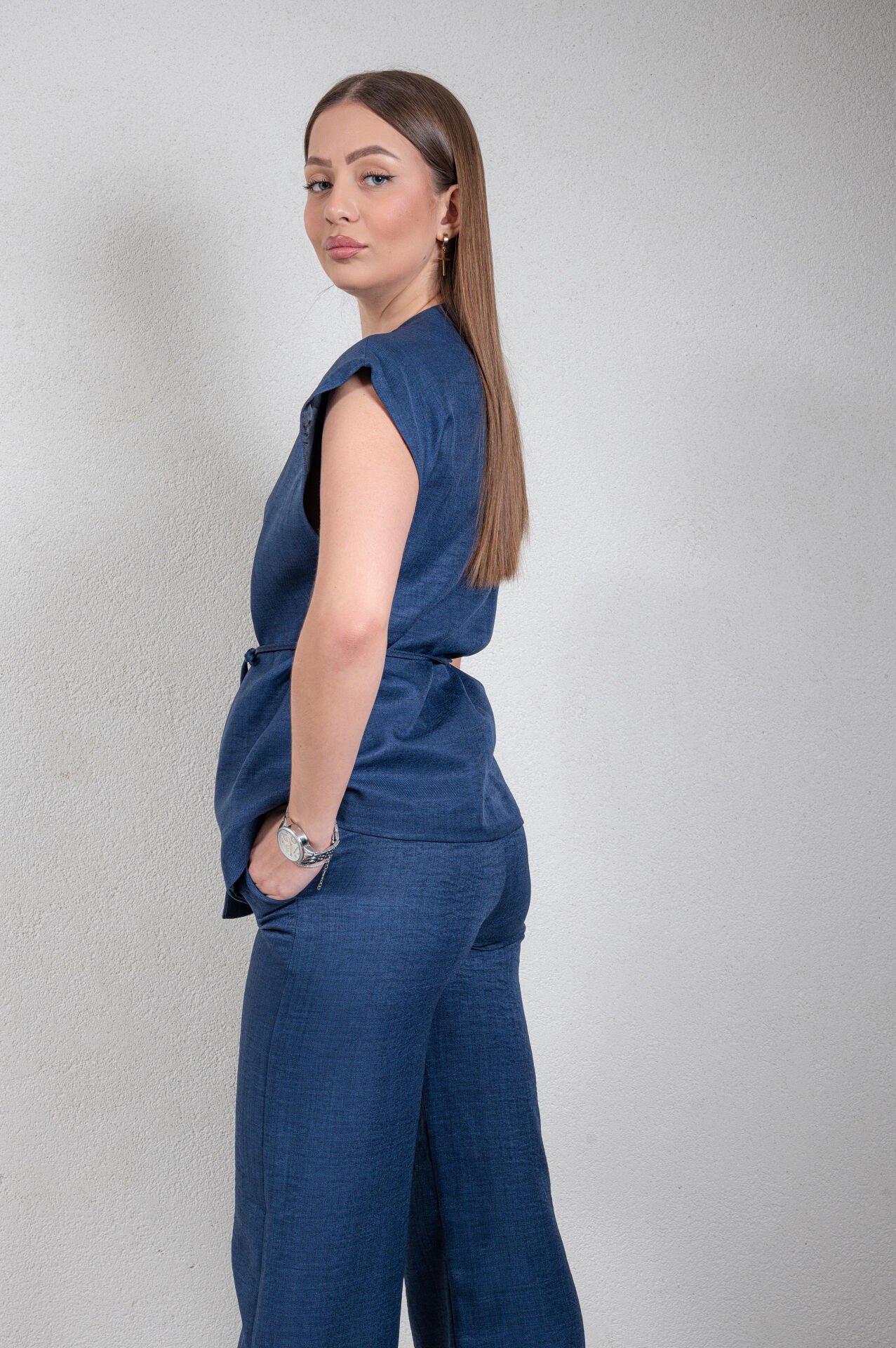 V yaka düşük omuz, düğmesiz, beli kemerli yelek. Üst ürün boyu : 61 cm, alt ürün boyu : 109 cm.