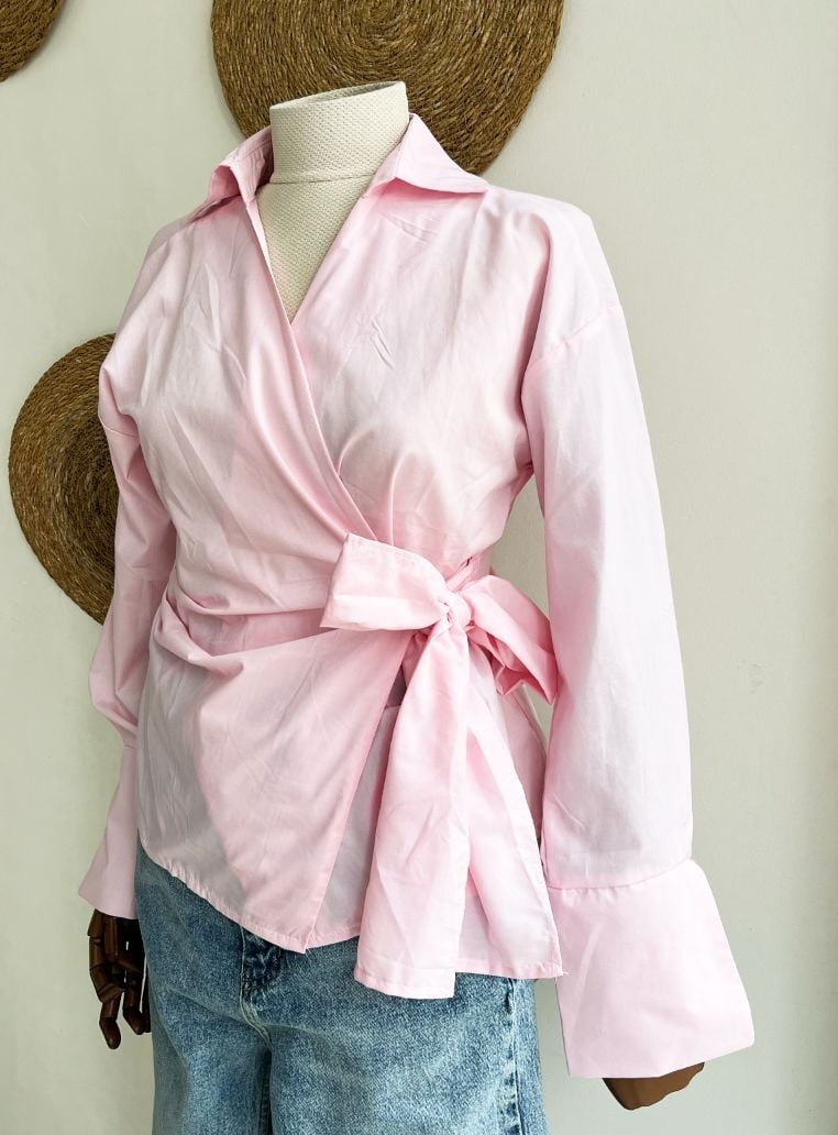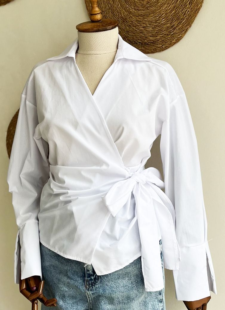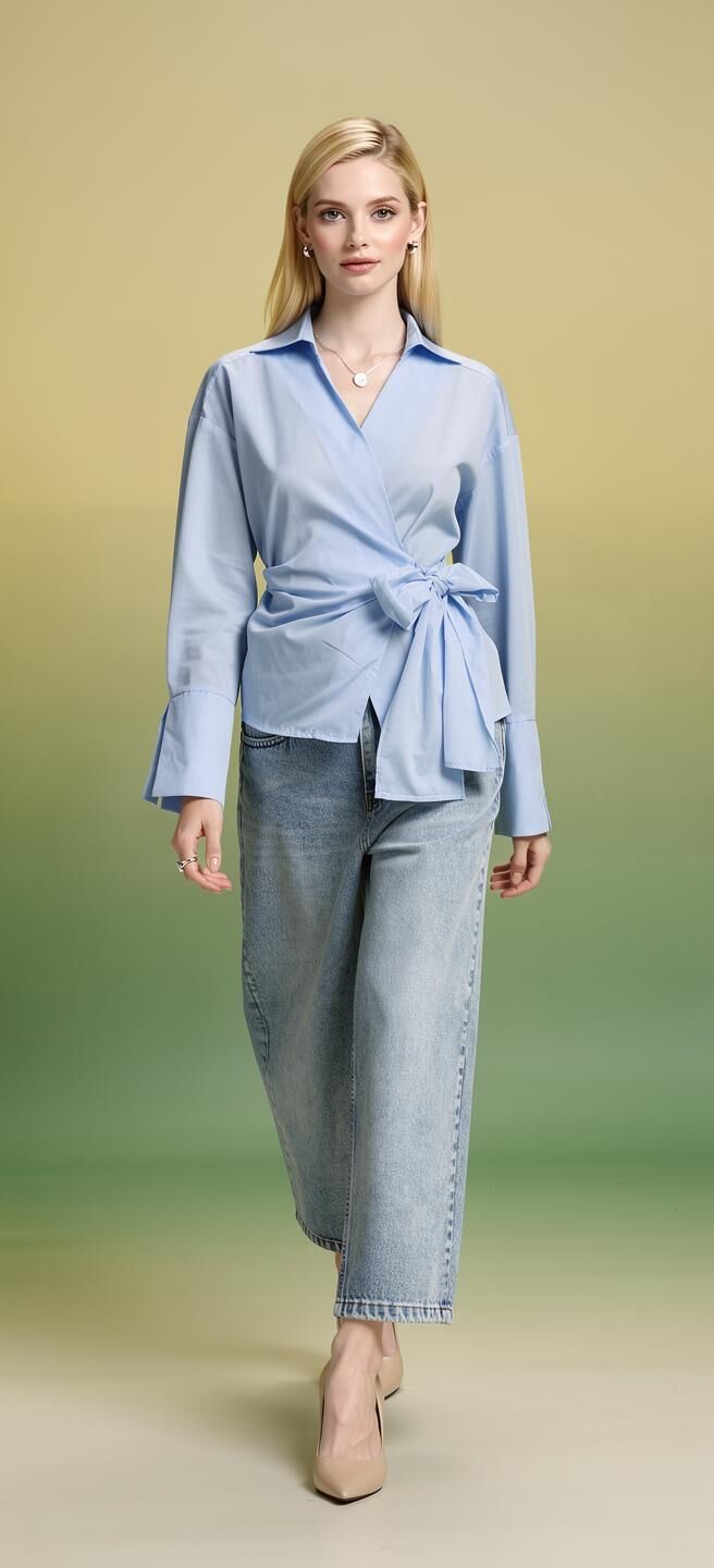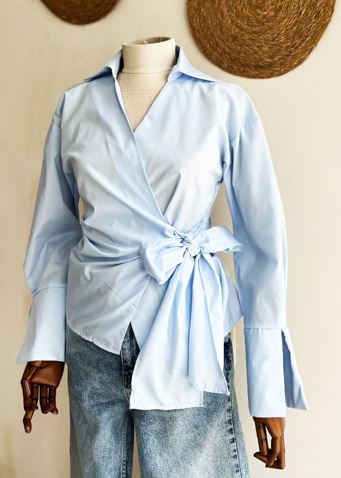 Boy 84cm, kol boyu 53cm, önden bağlamalı, düğmesiz, kolu manşetli ve yırtmaçlı, gök mavisi poplin gömlek.
