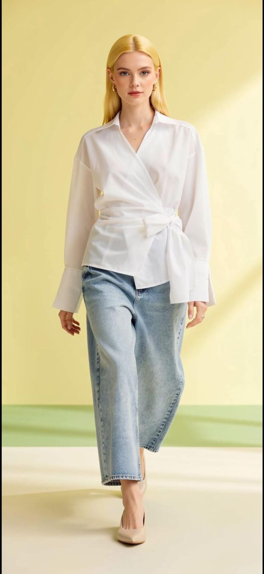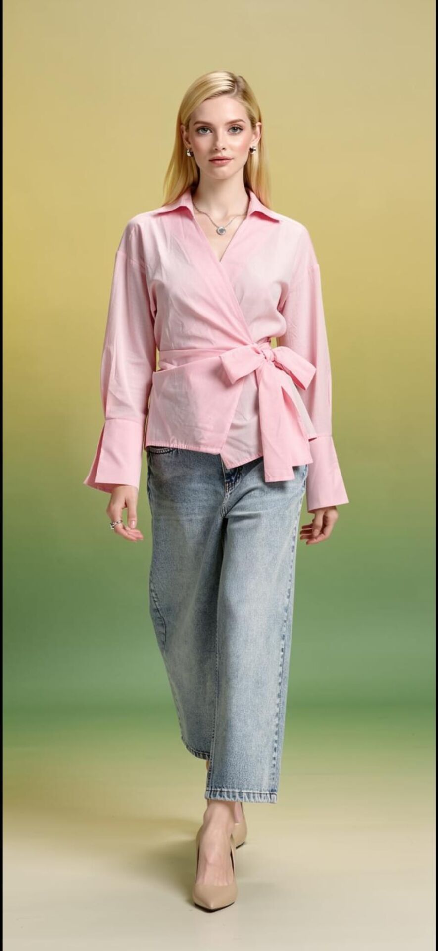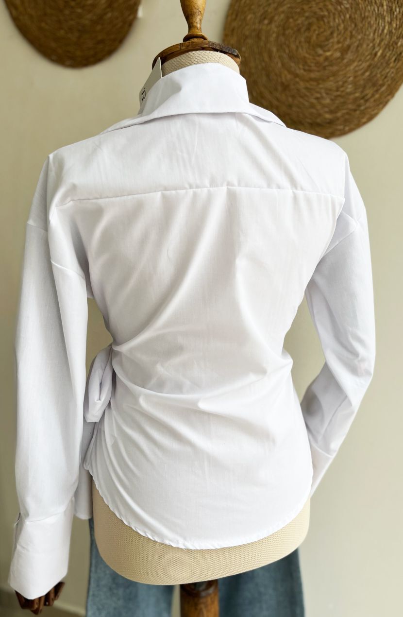 Boy 84cm, kol boyu 53cm, önden bağlamalı, düğmesiz, kolu manşetli ve yırtmaçlı, gök mavisi poplin gömlek.