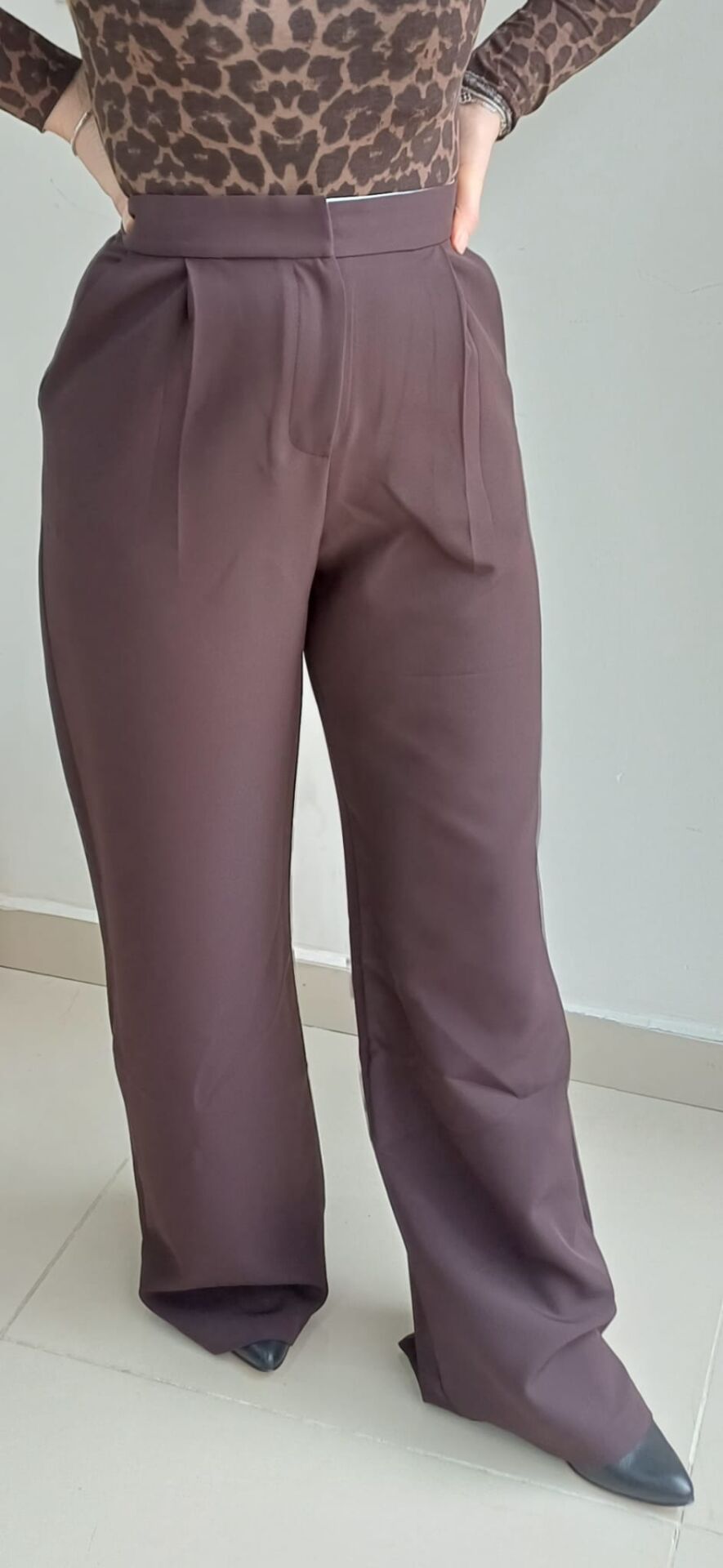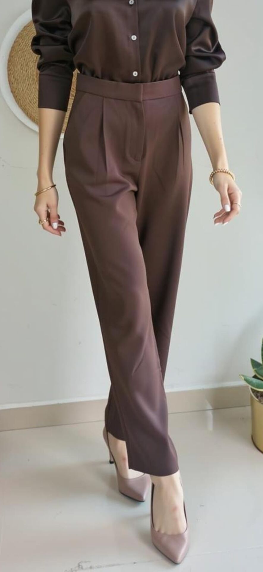 Pileli palazzo pantolon yanlardan cepli kahverengi