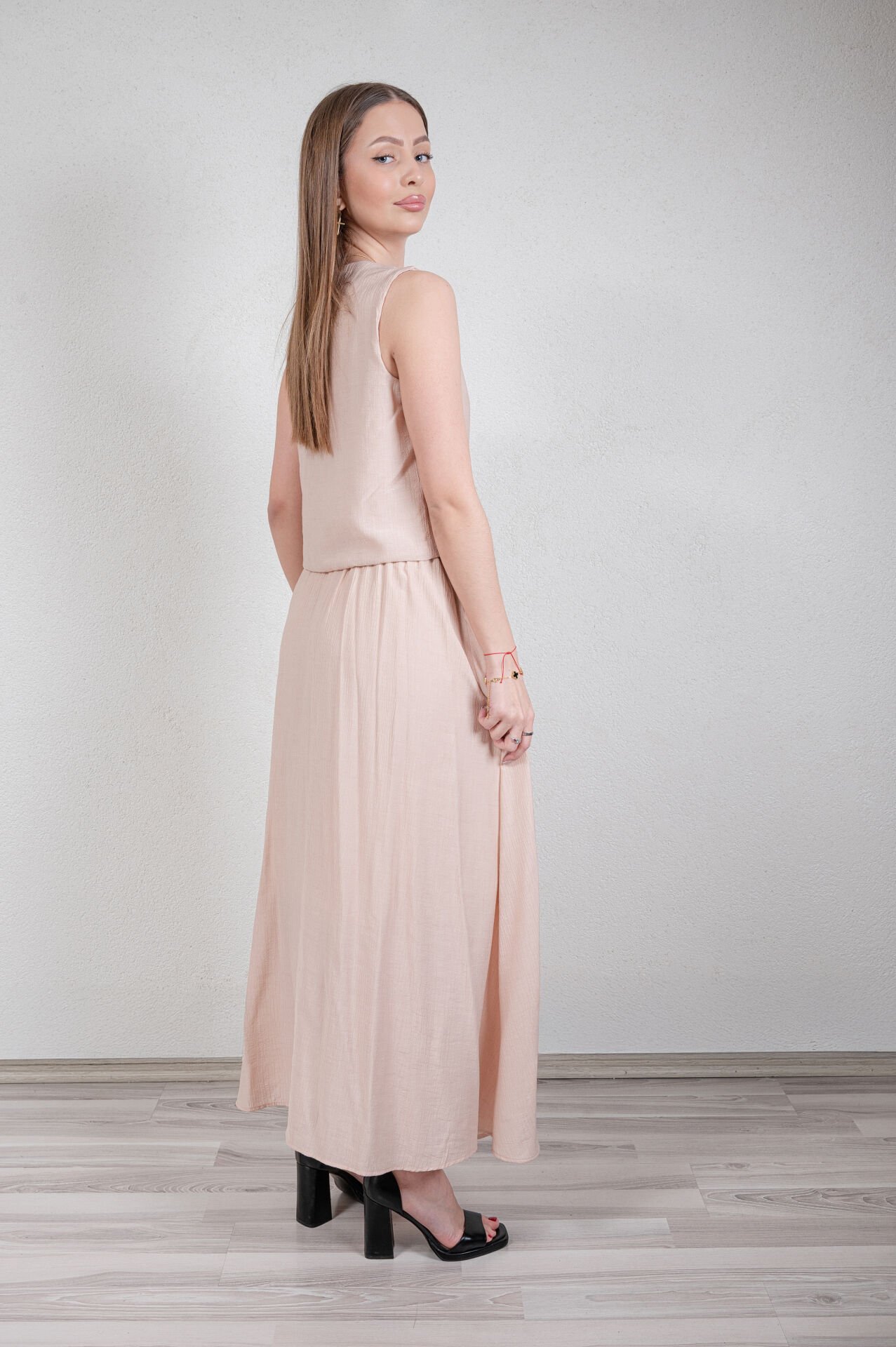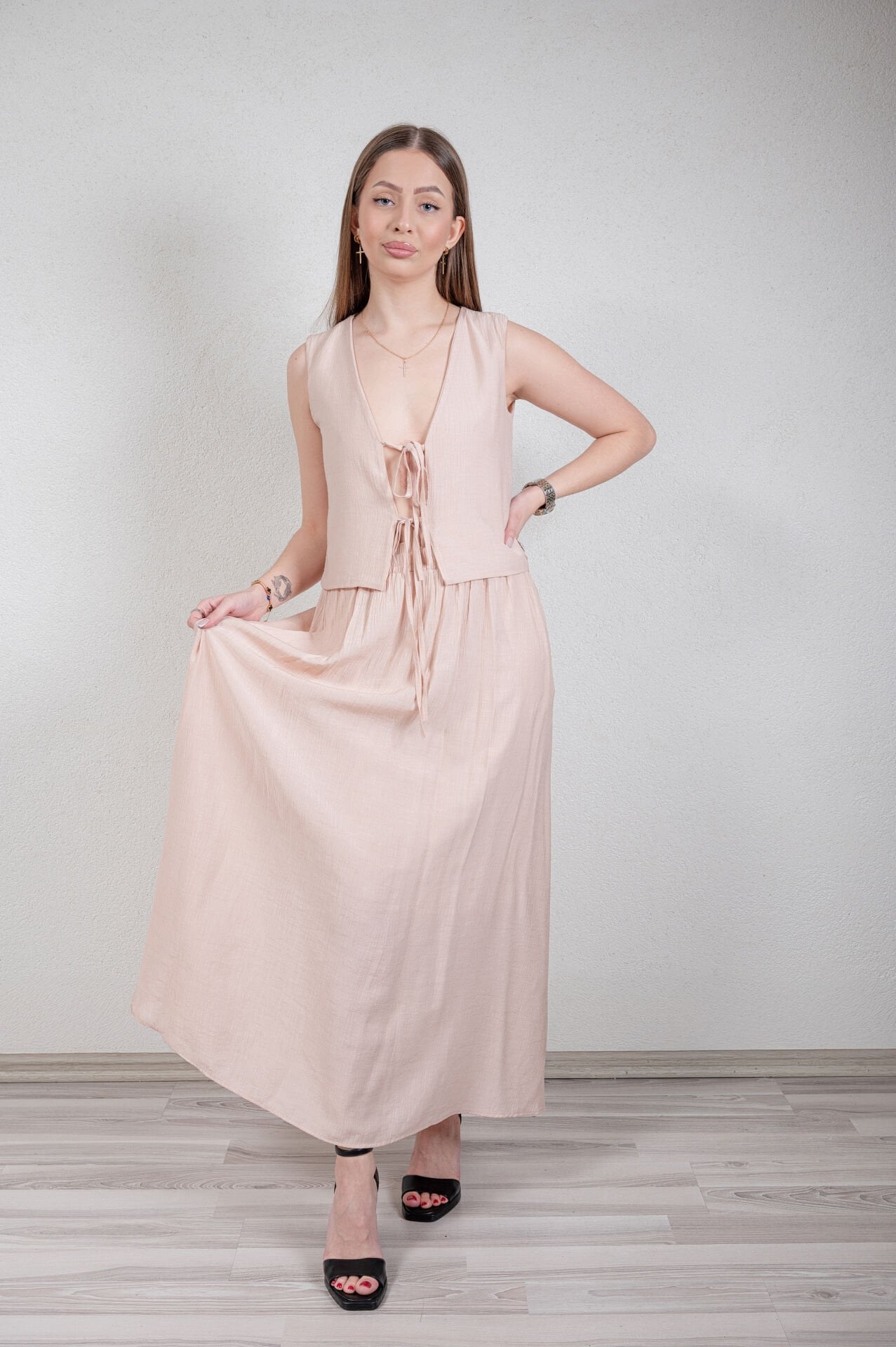 Kolsuz, v yaka, önden bağlamalı yelek. Kloş beli lastikli etek.Üst ürün boyu : 48 cm, alt ürün boyu : 95 cm