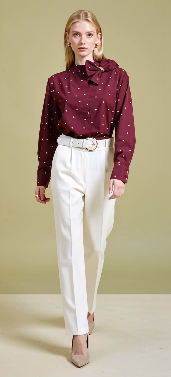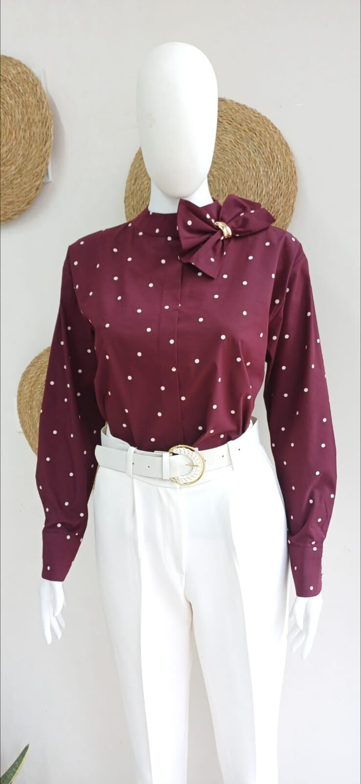 puanlı mürdüm bluz arkadan düğmeli yanda fiyonk detaylı