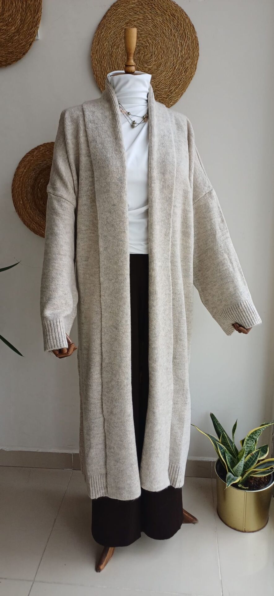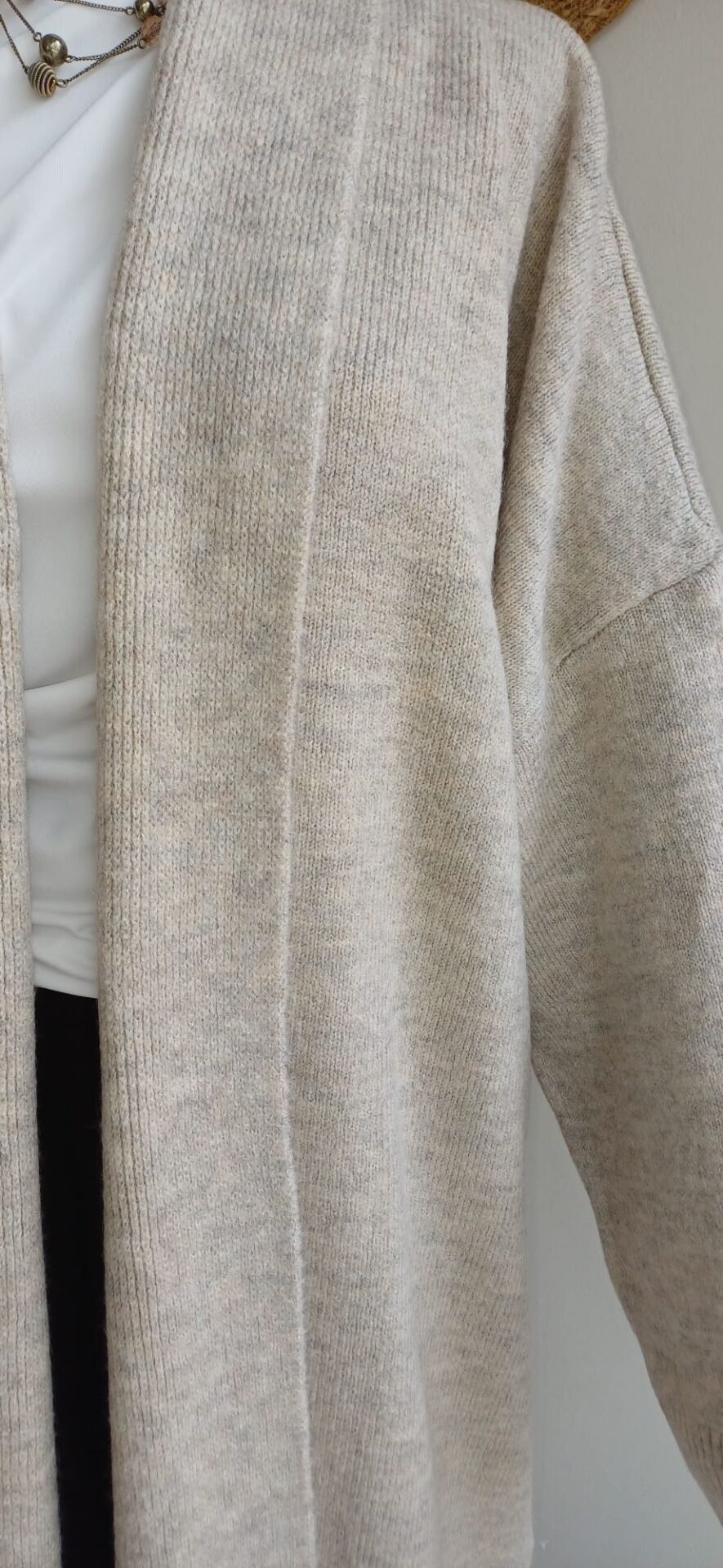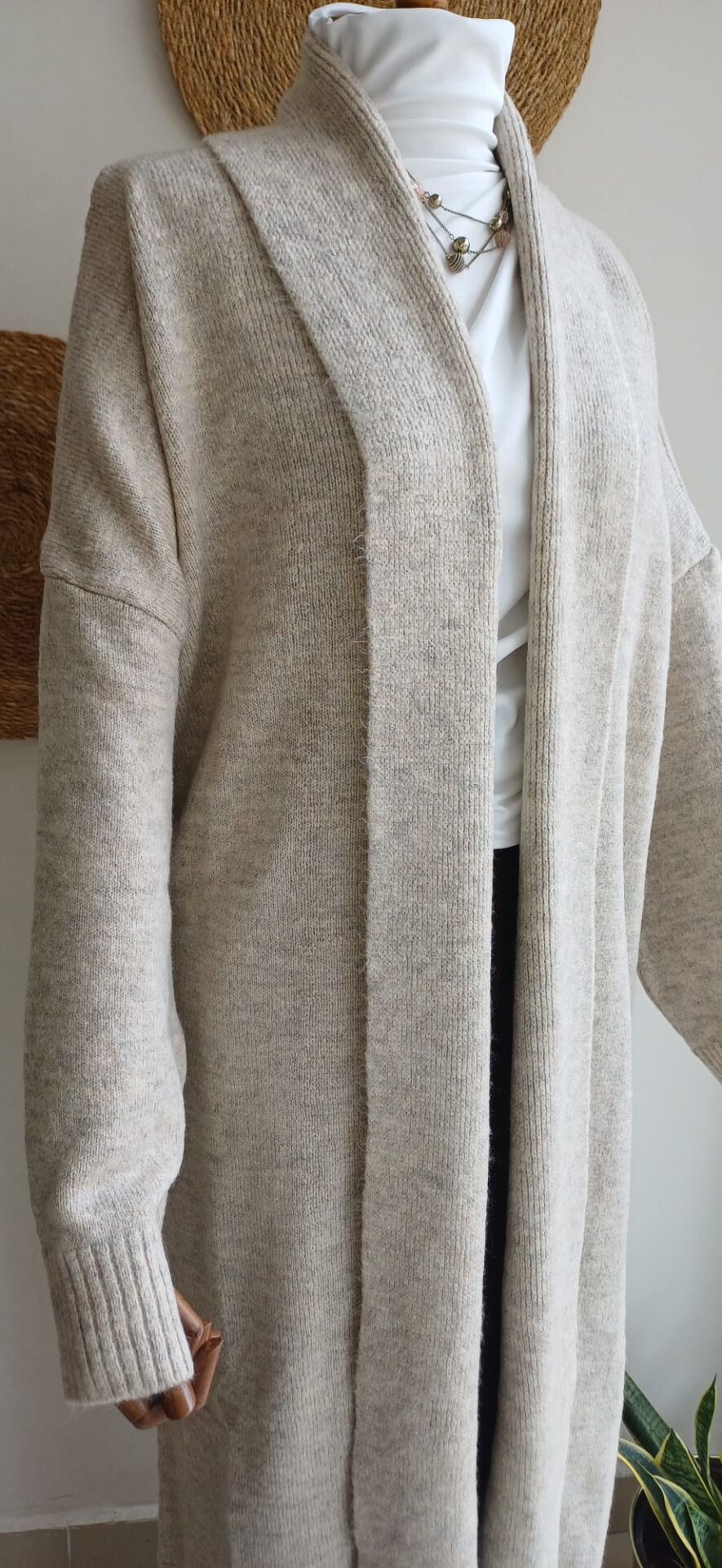 Önü açık şal yaka bej hırka, boy 118cm, düşük kol boyu 43cm, %80 akrilik %13 polyester, %7 PBT.