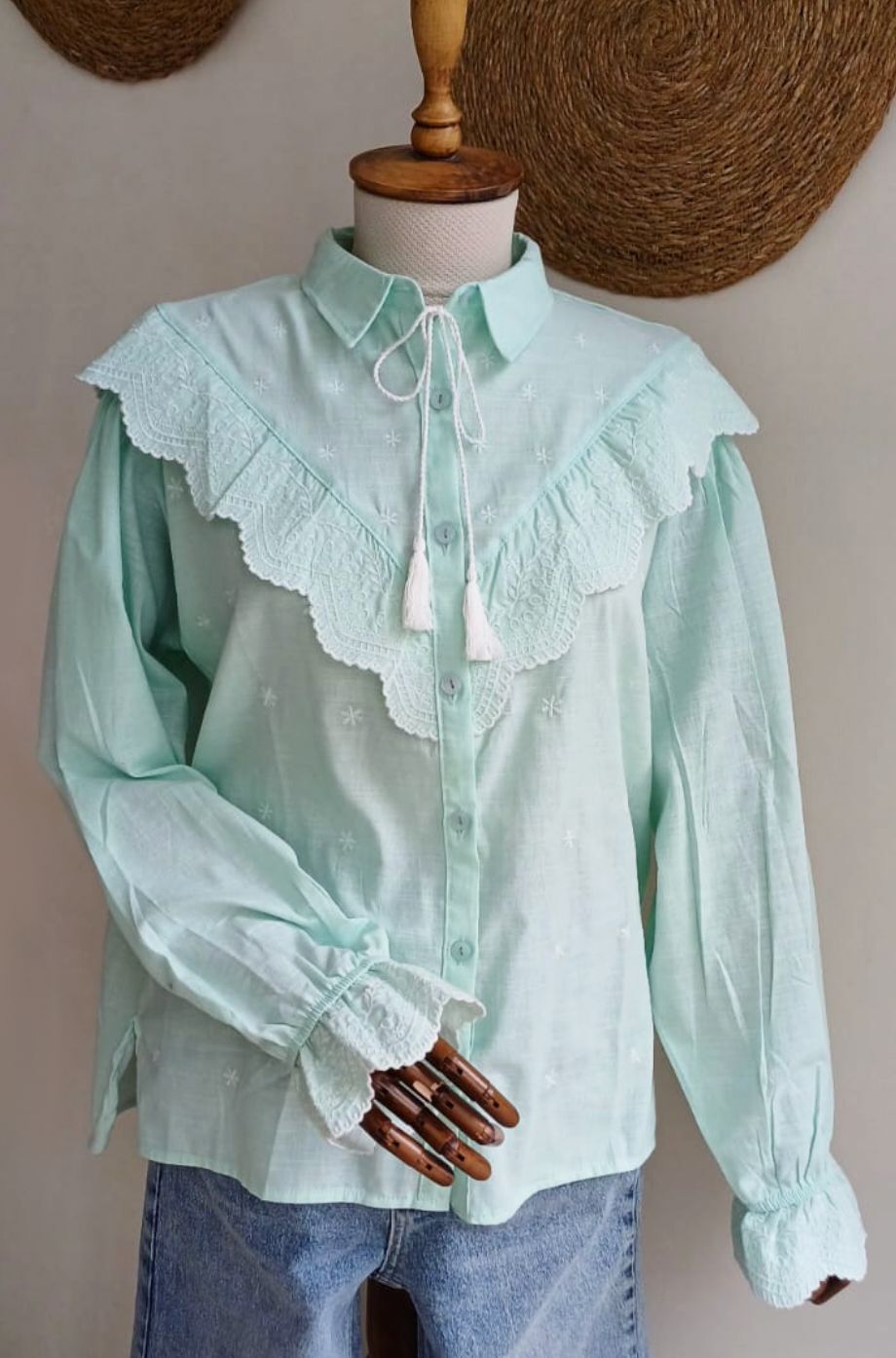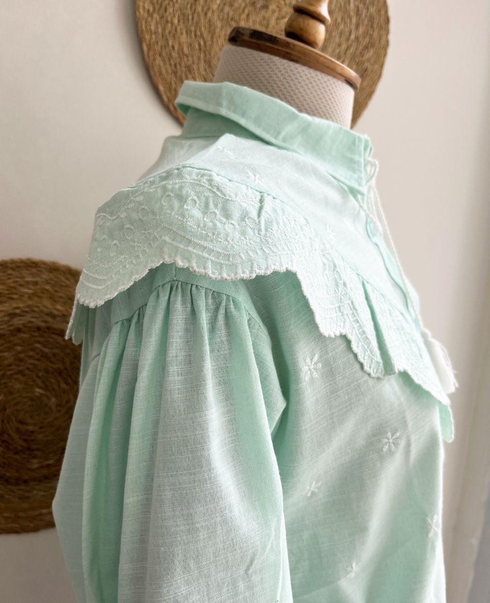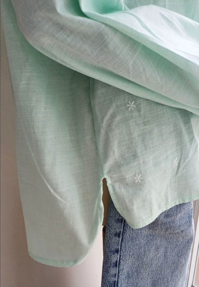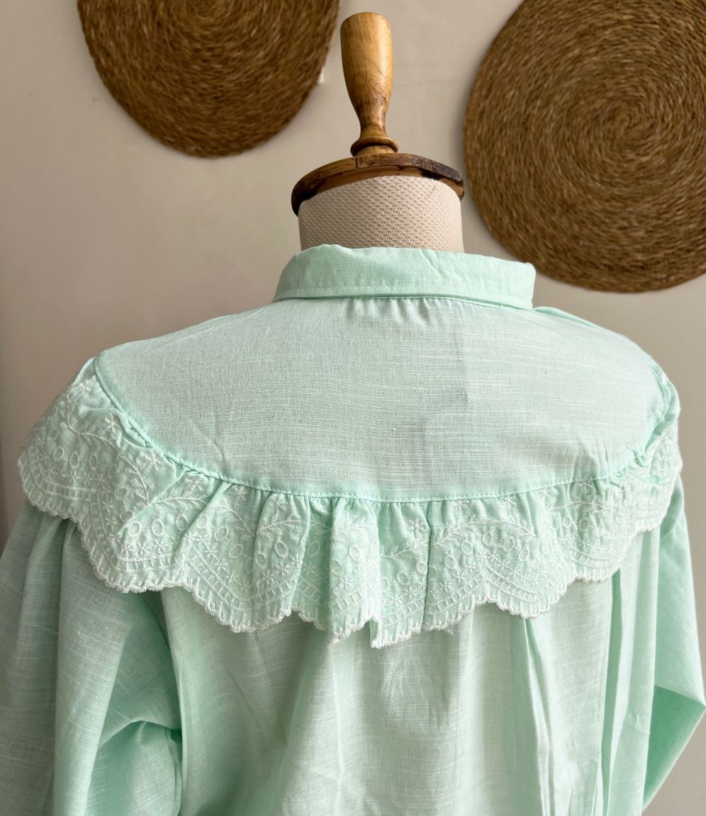 Boyu 64 cm, kolu 60 cm, önden düğmeli, % 100 polyester, kolu lastikli su yesili fistolu gömlek.
