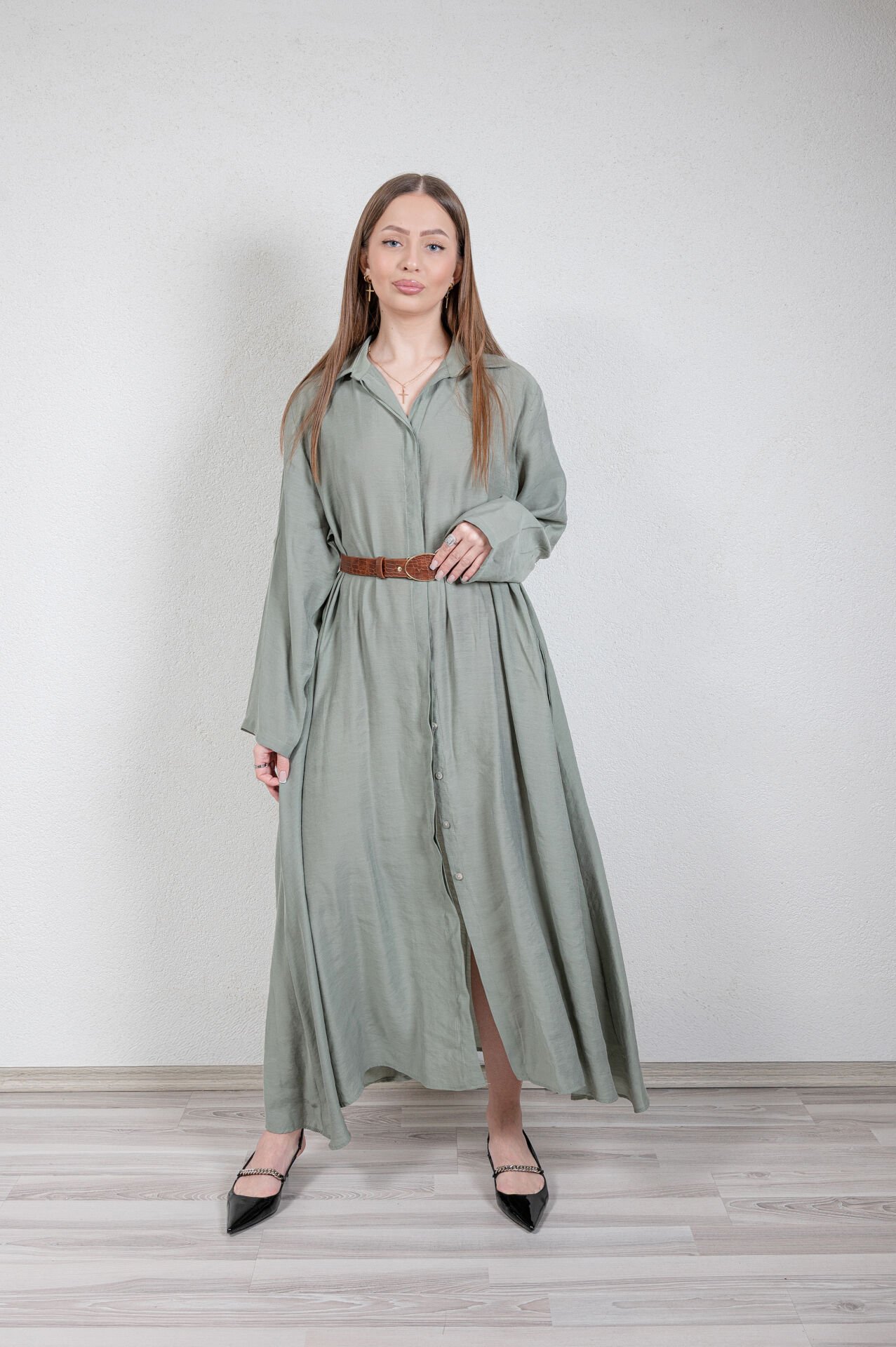 Uzun kollu, gömlek elbise, standart beden. Ürün boyu 128 cm, Kol boyu 57 cm.